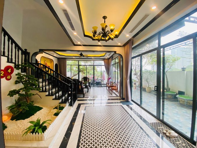 - Tầng 1: Sân vườn rộng + phòng khách + bếp & ăn + WC (cầu thang giữa, chờ thang máy)