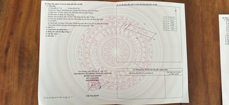- Diện tích 107m2, mặt tiền 5m vuông vắn. Đường thông thoáng, xung quanh toàn nhà vườn, biệt thự. Di chuyển ra KCN Tam Dương chỉ 3 phút.